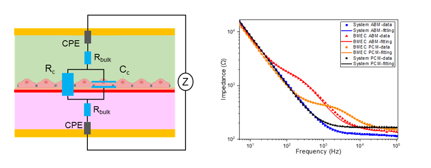 An equivalent circuit model is presented to demonstrate the simplicity of system representation. The impedance spectra shown on the right are representative examples obtained both experimentally and through theoretical modelling for membranes with and without an overlying cell barrier.